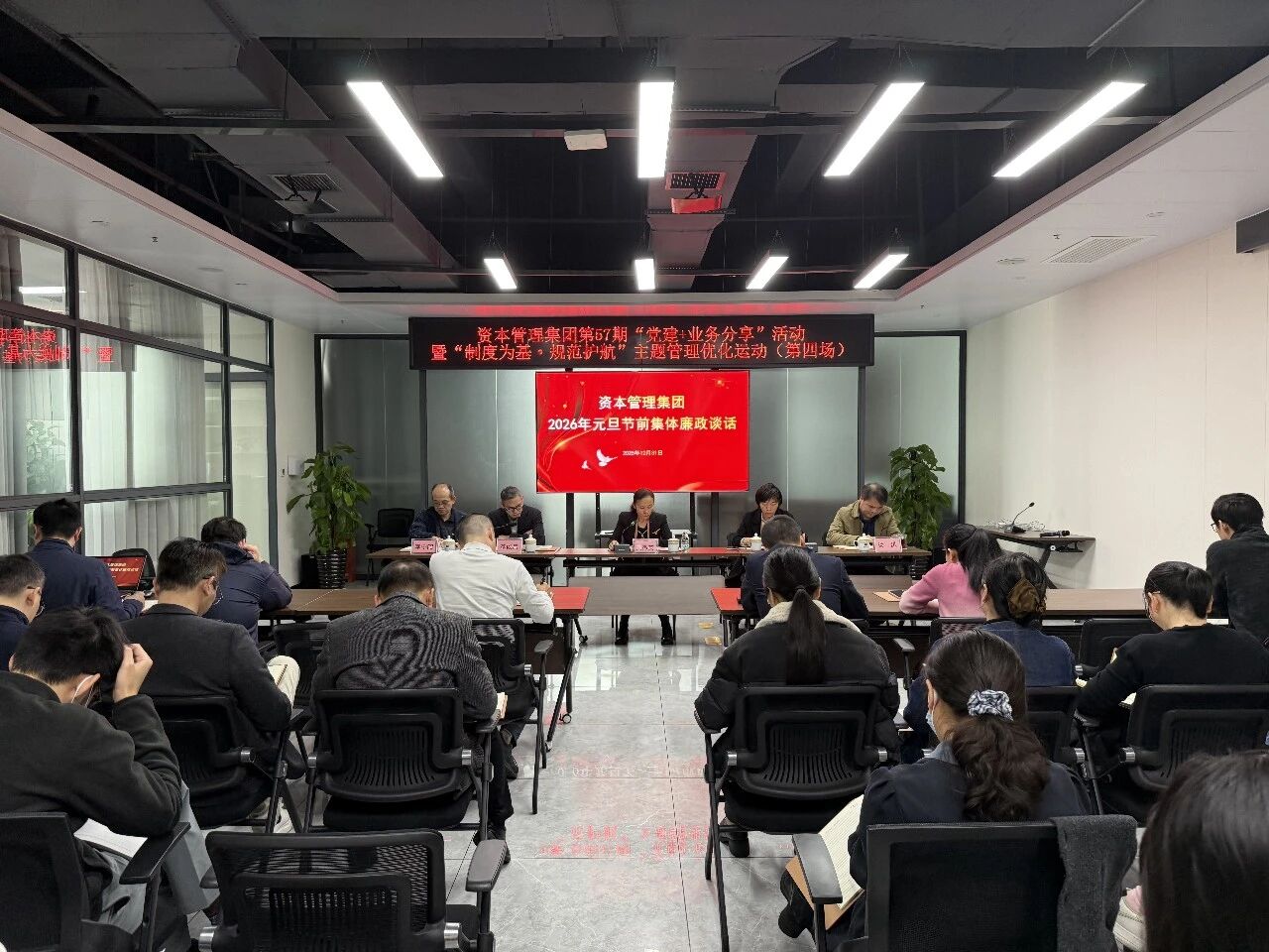 资本管理集团党委书记、董事长吴杰英在作活动小结暨2026年元旦节前集体廉政谈话时强调,一是要筑牢思想“防火墙”,全体员工必须持续提高政治站位,深刻领会中央八项规定精神的时代内涵与实践要求,时刻紧绷纪律之弦,守住底线,永葆清正廉洁的政治本色;二是要树立实干“风向标”,坚决纠治形式主义、官僚主义,大力弘扬求真务实、担当作为的优良作风,营造风清气正、干事创业的良好政治生态;三是要打好岁末年初“收官战”,全体员工要坚持系统思维,强化统筹协调,以更加过硬的作风、更加扎实的举措,确保各项工作有力有序推进,实现今年圆满收官、明年稳健开局。四是要拧紧节日安全“责任链”,严格执行领导带班和专人值班制度,做到人员在岗、责任到位、信息畅通,全力保障公司安全生产形势稳定,共同营造一个欢乐祥和、平安有序的节日氛围。